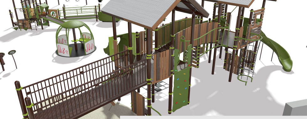 Functionally, the environment provided us with varying topography that we were able to leverage to create a more inclusive and dynamic play space. The fact that main play area was set down into a bowl from the main entrance allowed us to design a main play structure that could be accessed from both the "ground" and "top" levels! An inclusive ramp/bridge provided easy access for children of all abilities to the very top of the play structure.