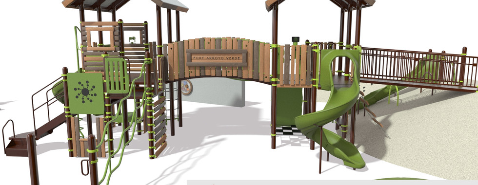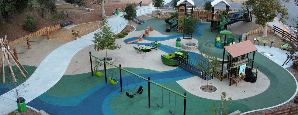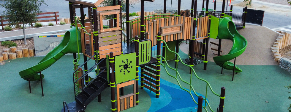 The play area at Arroyo Verde Park is tucked into the hillside of the park, and surrounded by beautiful trees and picnic areas. This natural environment informed our design directing from an aesthetic and functional perspective.